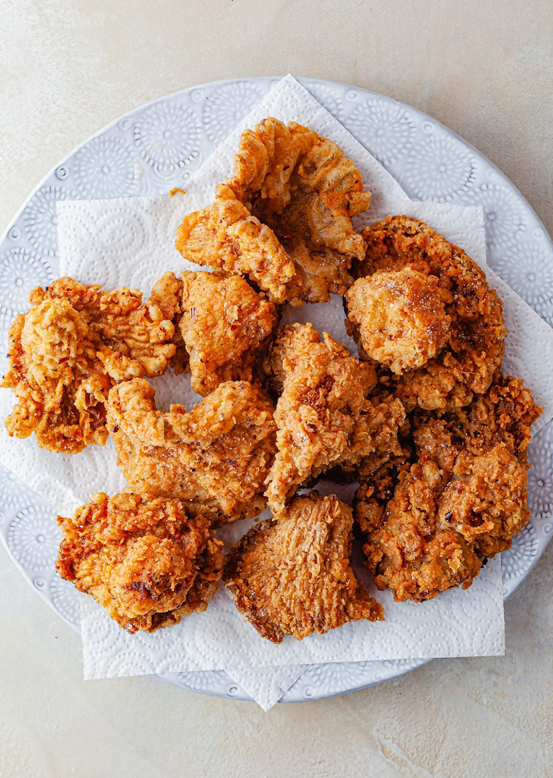 Cuando el aceite esté lo suficientemente caliente, sumerja un hongo en los ingredientes secos y revuelva para cubrir. Luego, coloque con cuidado el hongo en el aceite caliente y fríalo durante 2-4 minutos o hasta que esté dorado, luego retire el "pollo" frito con una espumadera y colóquelo sobre papel de cocina para absorber el exceso de aceite. Repita para los champiñones restantes.